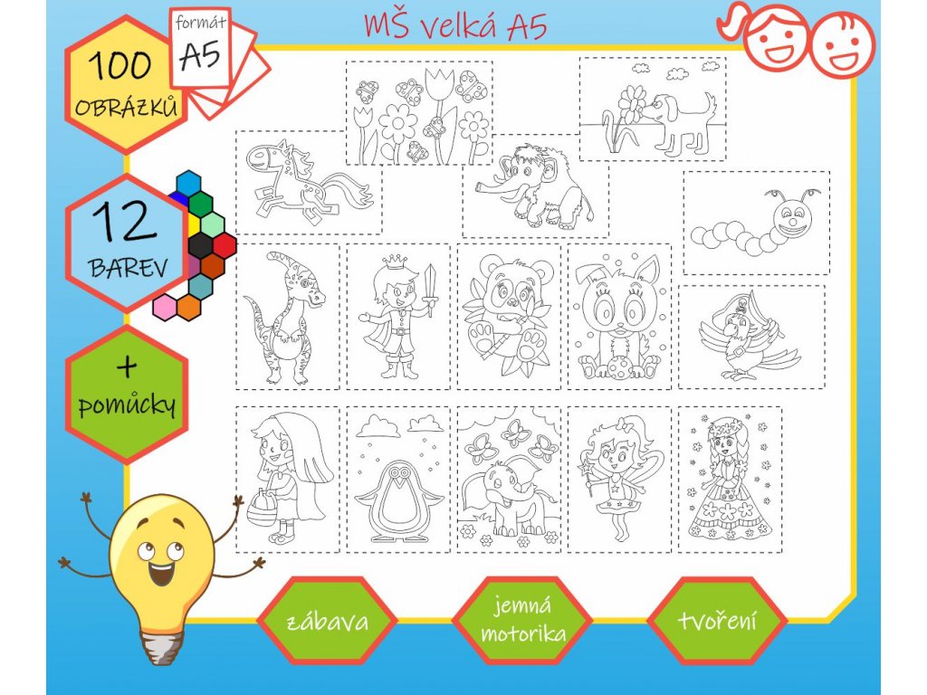 - 100x šablonu velikosti A5 - koníček, pejsek, micinka, karkulka, princ, sloník, papoušek pirát, mamut, dino 2, princezna s kytičkami, víla, housenka, tučňák, jarní motýlci, panda