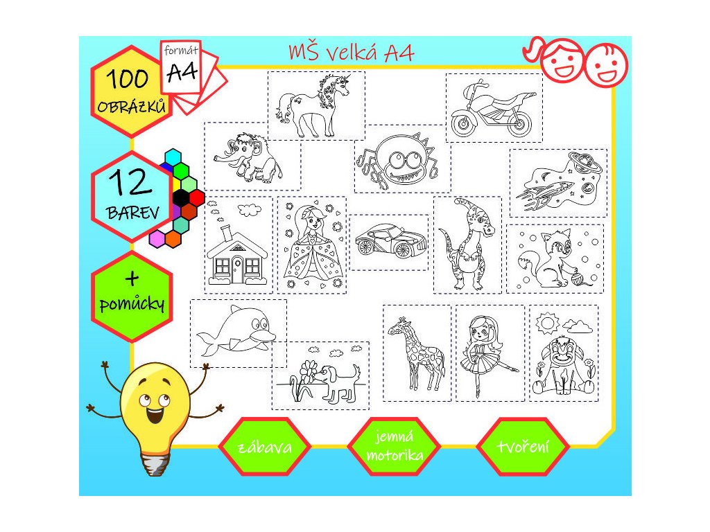 - 100x šablonu velikosti A4 - domeček, motorka, mamut, jednorožec, princezna se srdíčky, telátko, vesmírná raketa, pavouček, žirafa, dino 2, delfín, sporťák, baletka, koťátko, pejsek